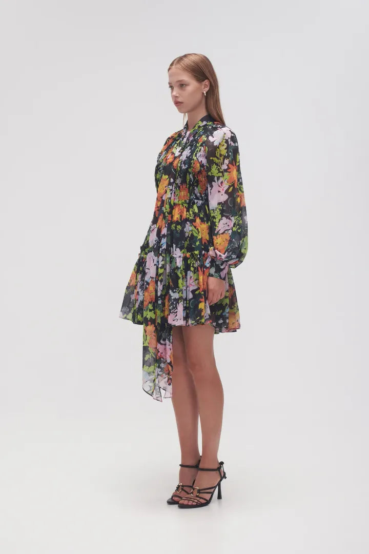 The Marlowe Mini Dress in Midnight Floral is a chic balance of sweet romance and contemporary edge. A shirred bodice helps it drape beautifully, while a bow tie neckline adds a whimsical touch of sophistication. The full blouson sleeves bring soft drama and the gathered skirt- finished with a delicately raw hem- adds playful movement. This dress captures eye-catching style and ease, making it a gorgeous pick for everything from sprightly garden parties to evening soirées.