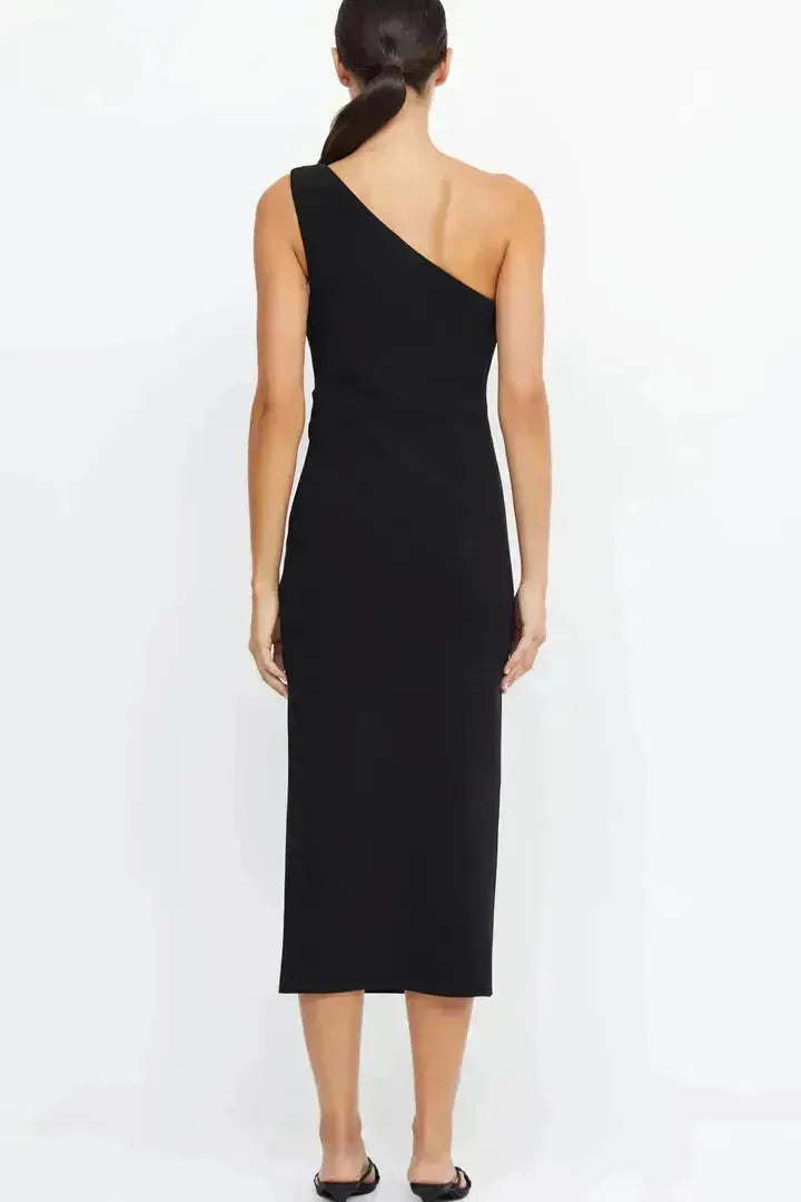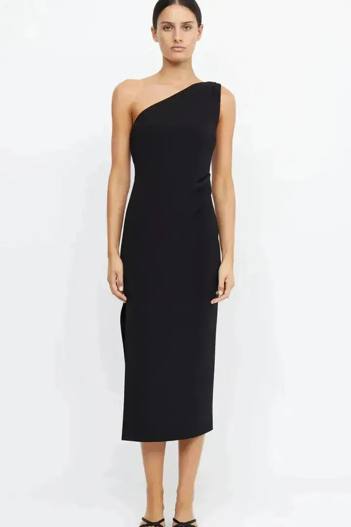 An easy to wear asymmetrical midi dress cut from a stretch bonded crepe fabric that cinches in the body and skims the silhouette. The one shoulder dress features a side split, slight gathering detail at the waist and hips for a more comfortable fit.