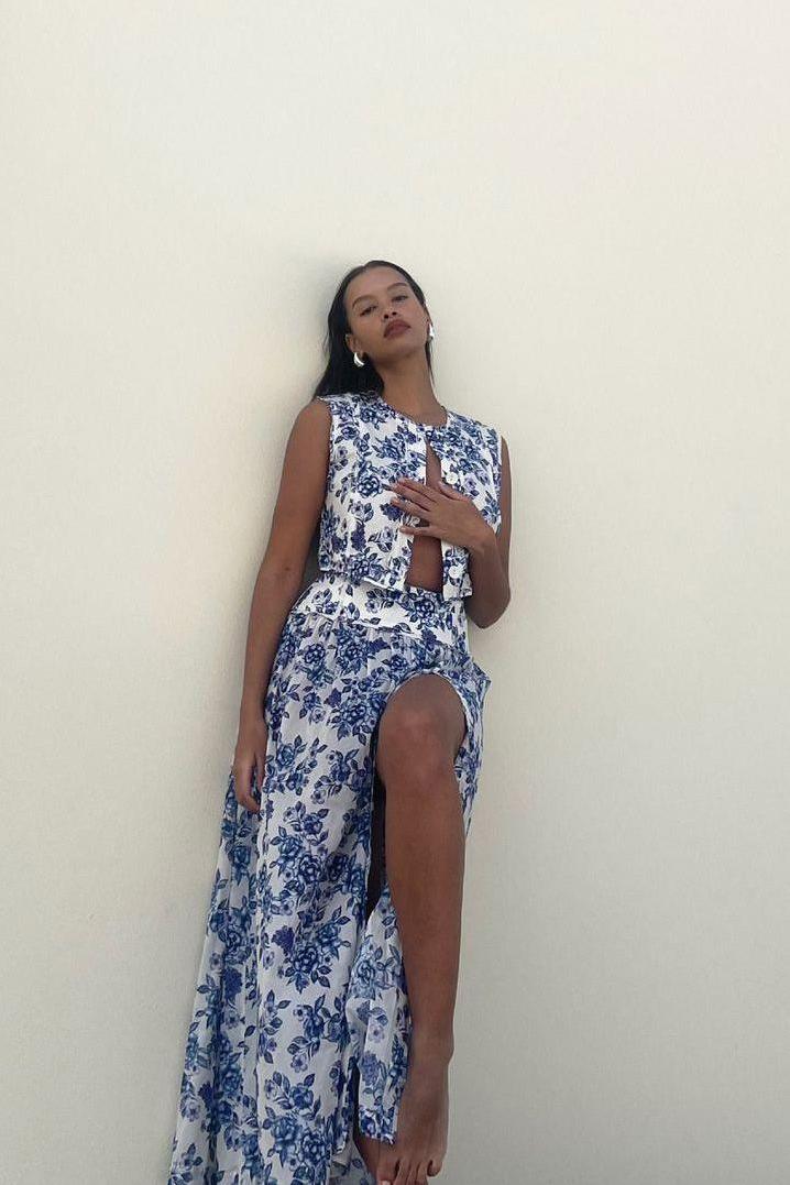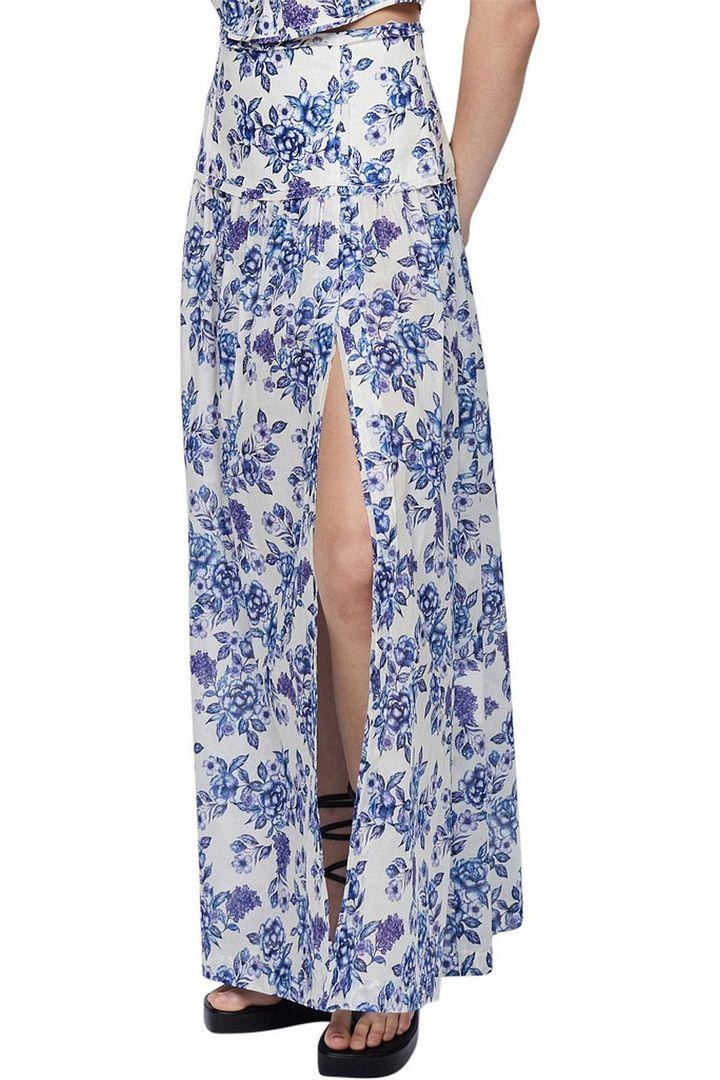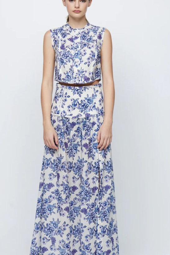 Meet Audette linen maxi skirt & top by Bec + Bridge, your go-to set for all occasions! Crafted from luxurious linen, this skirt features a fitted hip panel with a gathered skirt and high front side split for an effortlessly stylish look. Showcasing raw edge exposed bias strip at the bottom/top edge of the waist panel.