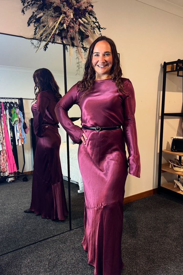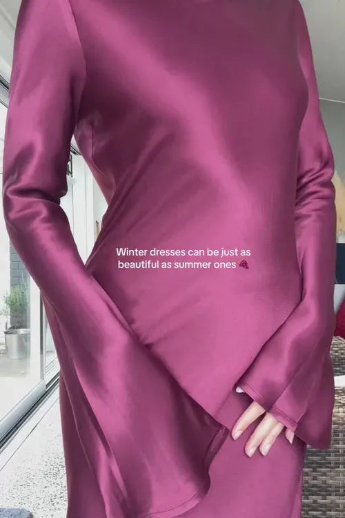 An elegant satin style with a bias cut, high round neckline, and long sleeves with a subtle flare. The ankle-length silhouette is finished with a keyhole and button closure at the back- sophisticated, timeless, and effortlessly classy.