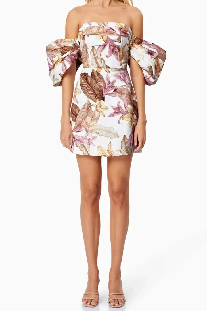 The Meadow Mini Dress, a versatile day to night ensemble featuring a fitted bodice with a draped neckline overlay, short puff sleeves, and a flirty mini skirt, all crafted from a breathable linen/rayon blend fabrication and secured with a discreet center back invisible zipper, ensuring effortless style for any occasion.