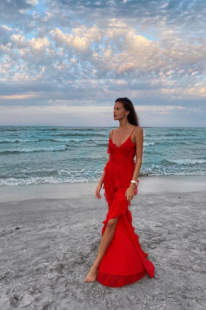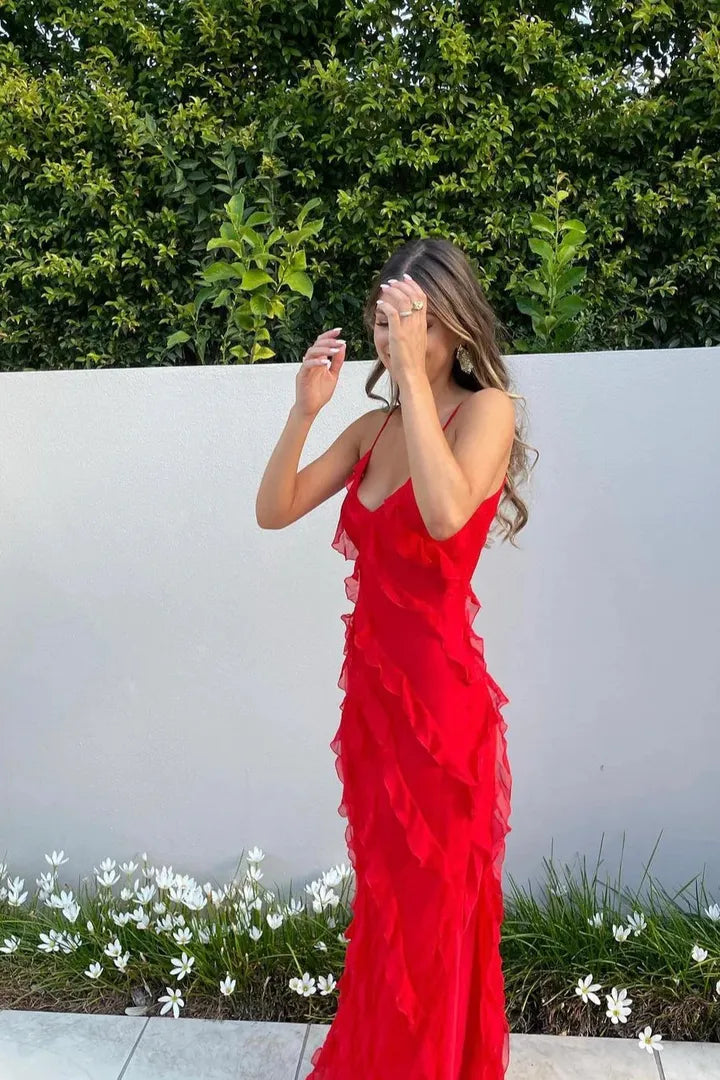 Crafted in a silk blend, this floor-length gown features cascading frills and a figure-skimming silhouette. Adjustable straps and full lining ensure comfort and ease.