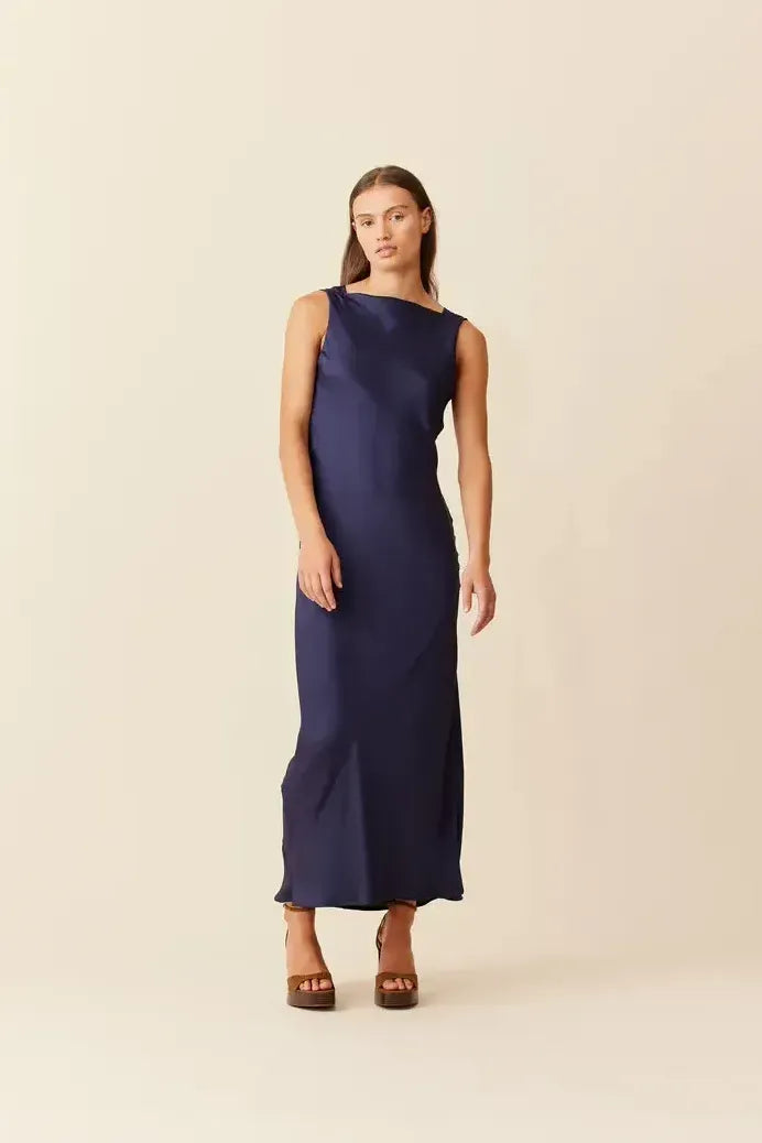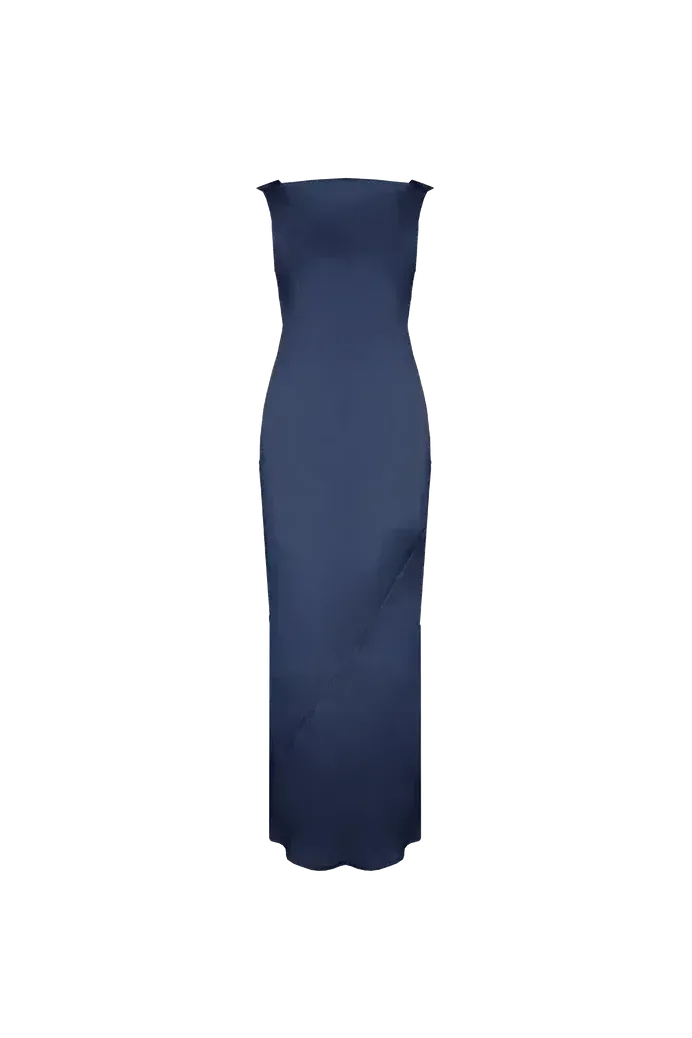 The Firebird Cowl Gown in Mulholland Navy. Dive into sophistication with this satin midi that strikes the perfect balance between sleek and striking. With a cowl back detail and waist tie to highlight your shape, this is your go-to for elegant evenings and nights to remember.